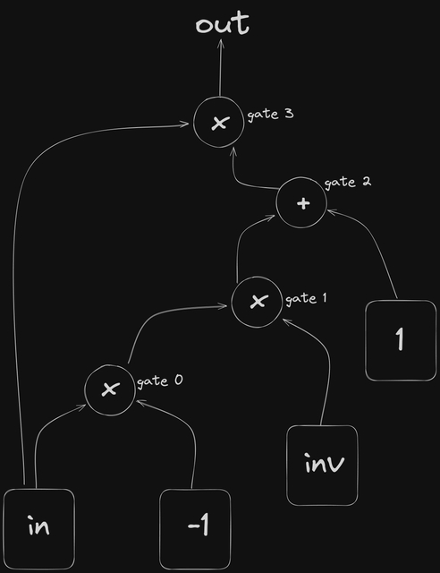 Recall the IsZero problem we are playing with, this is how it would be expressed as a Algebraic Circuit;