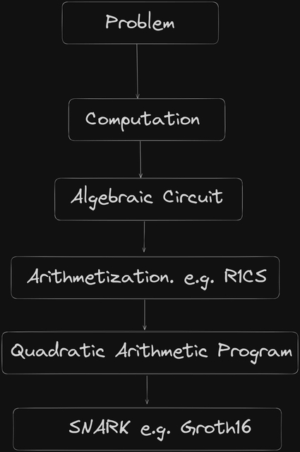 This chapter will be focused on navigating from Problem -> Computation -> Algebraic Circuit -> Arithmetization -> Quadratic Arithemetic Program.